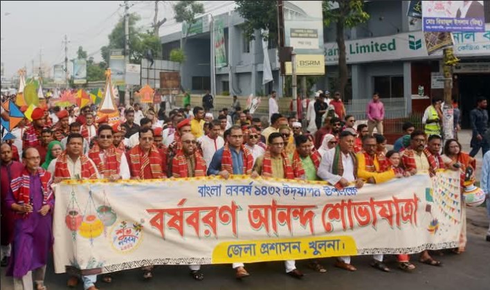 ডুমুরিয়া প্রতিনিধি,,খুলনাঃ যথাযোগ্য মর্যাদা ও আনন্দঘন পরিবেশে আজ (সোমবার) খুলনায় বাংলা নববর্ষ-১৪৩২ উদযাপিত হয়। খুলনা জেলা প্রশাসন আয়োজিত অনুষ্ঠানের মধ্যে ছিলো বর্ষবরণ আনন্দ শোভাযাত্রা, আলোচনা সভা, লোকজ মেলা ও সাংস্কৃতিক অনুষ্ঠান।