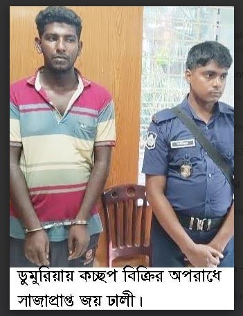 খবর পেয়ে ভ্রাম্যমান আদালত থানা পুলিশের সহযোগীতায় তাদের বাড়িতে অভিযান চালিয়ে ২৭পিচ কচ্ছপ উদ্ধারসহ অভিযুক্ত জয় ঢালীক আটক করে।এক পর্যায়ে বিজ্ঞ আদালত শুনানী শেষে বন্যপ্রানী ও জীববচিত্র্য সংরক্ষণ আইনে জয় ঢালীক ২১ দিনর বিনাশ্রম কারা-দন্ডাদেশ প্রদান করেন। এছাড়া জব্দকৃত কচ্ছপ গুলাে উপযুক্ত পরিবেশে অবমুক্ত করার নির্দেশ দেন।