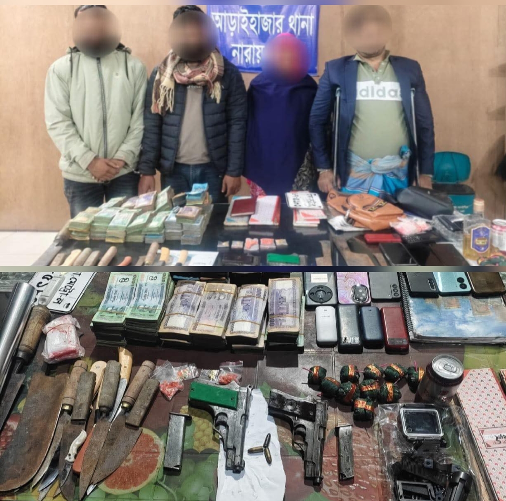 আজ মধ্যরাতে পরিচালিত ওই অভিযানে গ্রেফতারকৃতরা হলেন— নাঈম (৪২), রুনা আক্তার (৩৫), রুবেল (৩৫) এবং সুজন (৩০)। অভিযানের সময় তাদের হেফাজত থেকে ২টি পিস্তল, ৩ রাউন্ড এমুনিশন, ১ রাউন্ড কার্তুজ, ১৩টি দেশীয় অস্ত্র, ১০৫ পিস ইয়াবা ট্যাবলেট, নগদ অর্থ ও অপরাধমূলক কর্মকাণ্ডে ব্যবহৃত বিভিন্ন সরঞ্জামাদি উদ্ধার করা হয়।