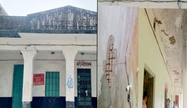 আব্দুল আউয়াল, ফকিরহাট (বাগেরহাট)ঃ বাগেরহাটের ফকিরহাট উপজেলার ঐতিহ্যবাহী বাহিরদিয়া মাধ্যমিক বিদ্যালয়ে ৯ শতাধিক শিক্ষার্থী প্রতিদিন জীবনঝুঁকি নিয়ে পাঠগ্রহণ করছে। ১৩২ বছরের পুরনো এই বিদ্যালয়ের বেশিরভাগ ভবনই এখন জীর্ণ ও ঝুঁকিপূর্ণ। পলেস্তারা খসে পড়ছে, ছাদ চুইয়ে পড়ছে পানি, কোথাও রড ঝুলে আছে খালি চোখে। তবুও বিকল্প না থাকায় চলেছে পাঠদান।